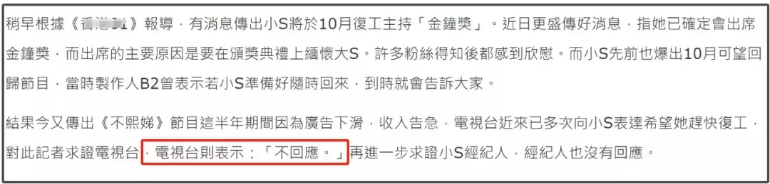 如今连电视台都避谈小S具体复出时间了,干脆表示不回应。
