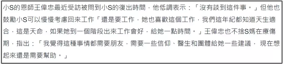 还有看着大小S长大的王伟忠,接受媒体采访的时候,对外透露小S一直没有和他聊过复出的事,在他看来不管是小S和S妈,都需要时间慢慢恢复,王伟忠支持小S复出,不过话里话外还是希望小S准备好。