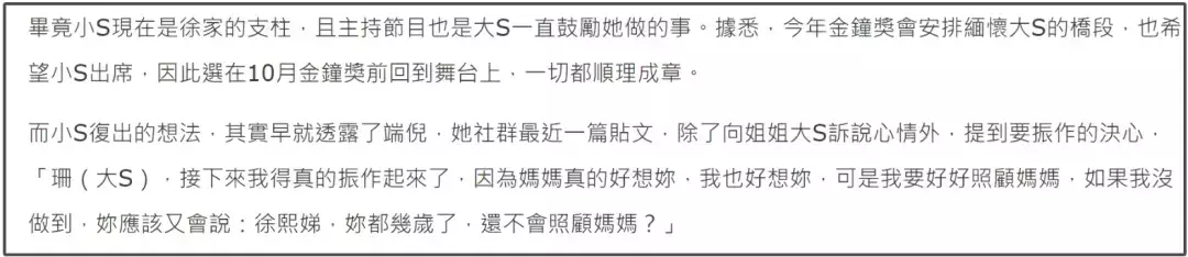 正如小S自己所说,从小到大,她都在大S保护之下,如今大S不在了,某种程度上,小S一旦复出,就是她首次独自面对娱乐圈考验的时刻了。