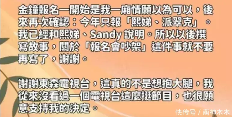 说起来,今年大部分时间都是吴姗儒主持,制作人想要报名今年的奖项很正常,最后没成功的原因制作人没说,从“只报了小S、派翠克”就能看出,有些人大概率不太乐意了。