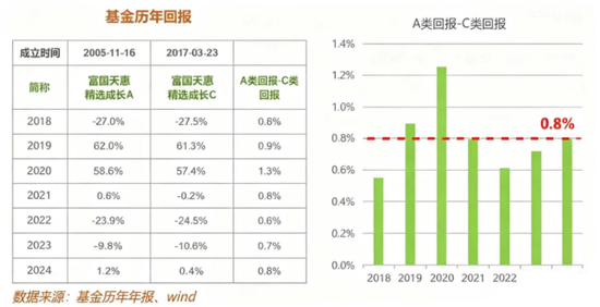 从长期业绩表现来看,A类与C类的差距也能直观体现出来。以富国天惠精选成长为例,A类比C类份额的历史业绩平均每年高出约0.8%。这一差距的核心,正是源于C类份额每日计提的销售服务费——这部分费用会直接从基金资产中扣除,相当于每日从净值中“划走”一笔成本,拉低了单位净值的增长速度。