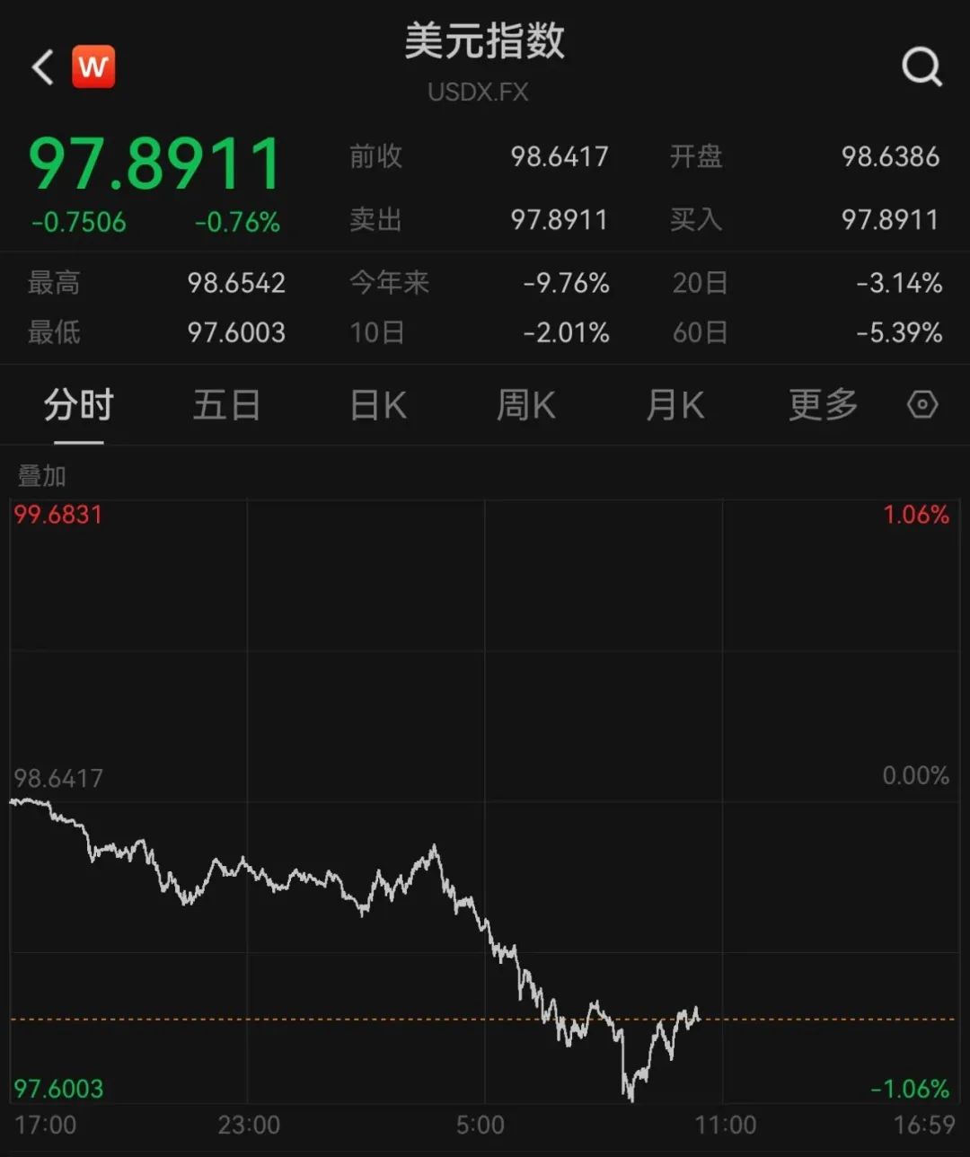 美元指数大跌,盘中一度跌超1%,创2022年3月以来新低。截至北京时间22:26,美元指数跌0.76%,报97.8911。