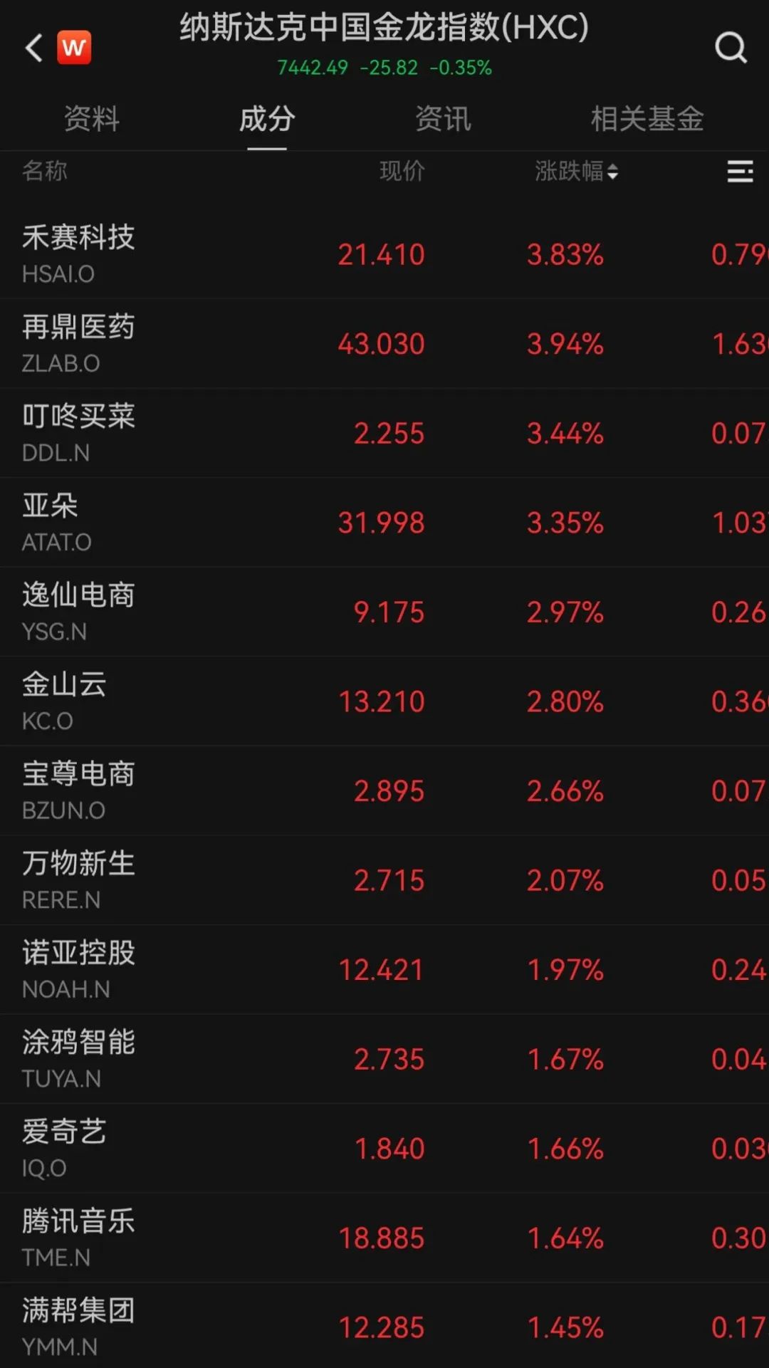 热门中概股涨跌不一。截至北京时间22:26,纳斯达克中国金龙指数跌0.35%,指数成分股中,禾赛科技、再鼎医药、叮咚买菜等涨超3%。