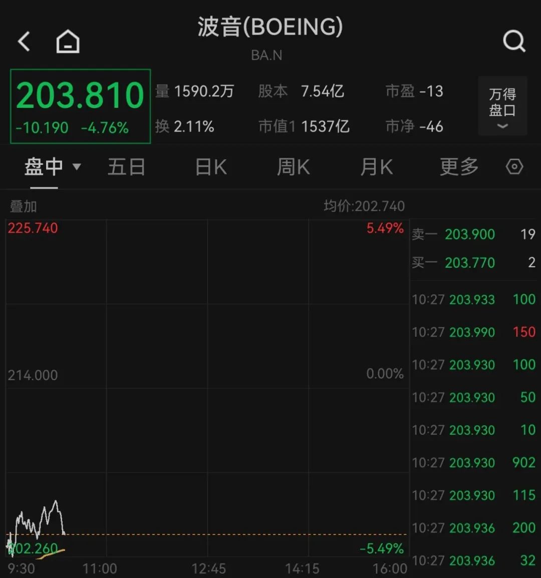 波音股价开盘即下跌,截至北京时间22:27,波音股价下跌4.76%。